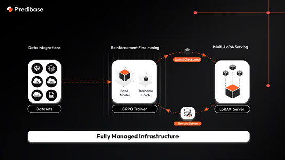 而Predibase提供的RFT平台是完全托管的无服务器平台,用户无需管理底层服务器或基础设施,平台自动处理训练、部署和推理全过程,大大降低了开发和运维复杂性。此外,RFT利用多LoRA框架和流式微批处理技术,实现了高效的训练和推理。