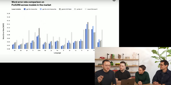 在性能方面,这两款语音模型相比上一代OpenAI的Whisper模型有了明显提升,能够更精准地捕捉语音中的细微差别,减少转录错误。测试结果显示,最新语音模型的词错误率大幅降低,也比同类的模型更好。