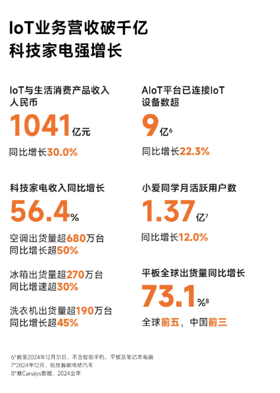 另一大亮点则是 AIoT 业务板块里,大家电(即「空冰洗」产品)的增长。2024 年,小米空调产品出货量超 680 万台,同比增速超过 50%;冰箱产品出货量超 270 万台,同比增速超过 30%;洗衣机产品出货量超 190 万台,同比增速超过 45%。