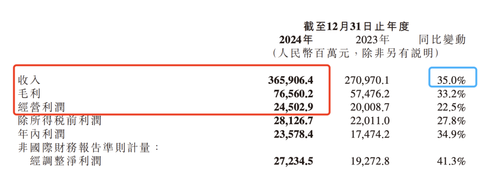2024 年,小米集团总营收达 3659.1 亿元,同比增加 35.0%。其中,毛利为 765.6 亿元,经营利润 245.0 亿元,分别增长 33.2% 及 22.5%。