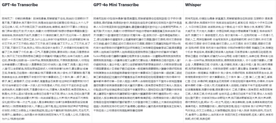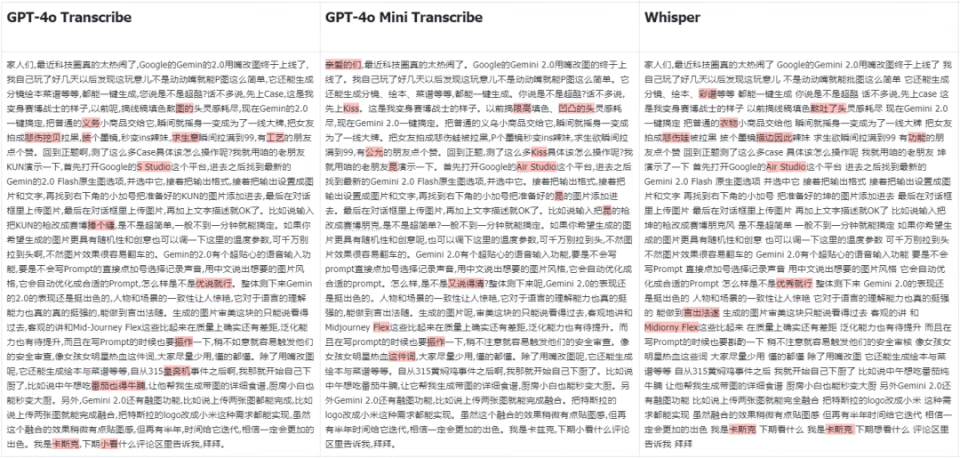 昨晚11点的时候突然发了一个预告,4秒钟的音频的大概意思,就是太平洋时间10点我们发个产品。然后就在北京时间凌晨1点,开了一场直播,发了一些新玩意。2个比Whisper更好的语音转文本的STT模型:gpt-4o-transcribe和gpt-4o-mini-transcribe,1个文本生成语音的TTS模型 :gpt-4o-mini-tts。这些模型都提供了API的接入方式。没了。1. STT模型:gpt-4o-transcribegpt-4o-transcribe和gpt-4o-mini-transcribe说是两个,其实也就是一个了,后者是前者的小参数版。这个模型的作用跟当年的Whisper是一样的,跟大家在剪映里用的一键生成字幕的作用也是一样的,就是把一段语音,转成对应的正确的文本。我们一般把他们称为,STT(Speech-to-Text)模型。这个模型的核心,就是就是识别文字的准确率有多高,我相信大家在用剪映生成字幕的时候,一定会出现很多文字识别错误的情况,所以评判一个ASR模型效果咋样,就看正确率。这个是OpenAI的几个STT模型在FLEURS数据集上的词错率(Word Error Rate, WER)的对比表现。纵坐标表示词错率,越低代表模型的转录准确性越高;横坐标代表不同语言。词错率的意思就是用于衡量语音识别系统的准确性,它通过计算模型转录文本与人工参考文本之间的错误比例来得出,错得越少,WER越低,模型的表现也就越好。中文是从左往右数第五个,cmn,可以看到突出了一个小山丘,错误率一下子就都上来了,比隔壁几个都要高一些,中文还是难。。。最后那几个一柱擎天的语言都比较小众,比如bn是孟加拉语、mr是马拉地与、最高的那个ml是马拉雅拉姆语。。。他们除了跟自己比外,又放了一个跟别人家模型相比的图。Gemini是google的,scribe是Anthropic的,在对比的这些里面,确实达到了SOTA,但是不知道没比的模型里面,有没有比OpenAI更强的。我自己也做了一下实测,把我的两个口播视频去识别了一下,识别出来的效果在此,大家可以对比一下。标红的就是识别错误的地方。其实都大差不差,这么一看,GPT-4o-mini-transcribe的性价比感觉非常突出。GPT-4o-transcribe这个系列的两个模型,有一个蛮不错的特点,就是会自动清噪和去除非主线人物的语音识别。这个片段是剪辑完的成片,所以有音乐,甚至在19秒以后,还有BGM里面的别人唱歌的声音,这些其实都是噪音,GPT-4o-transcribe几乎全部剔除了,在整个转录里,我几乎没看到什么错误,除了把我的名字,卡兹克识别成了卡斯克。。。我又试了一段粤语的,效果居然还可以,大致的好像是对的,就是细节这块我不太能验证了,有懂粤语的朋友可以看一下。gpt-4o-transcribe是每分钟大概$0.006,也就是人民币0.004元/分钟;gpt-4o-mini-transcribe是每分钟大概$0.003,也就是人民币0.002元/分钟.在英语效果和声音上,听了下,还算不错,不过毕竟这是国内,所以其实我更关注的是中文的生成效果。情绪什么的其实讲道理,还可以的,就是这个中文发音,真的一股子大佐味,这到底用的什么数据集啊。。。11Labs也有这个问题,中文根本没法听,太违和了。对比一下海螺(现在产品也更名叫Minimax了),他们的Audio生成出来的同文字的中文是这个效果。在发音上,根本就不是一个级别的,中国人的语音模型,还是得看中国制造。。。英语上,感觉很纯正,日语发音上,也感觉有点怪怪的。。。这次OpenAI给gpt-4o-mini-tts做了一个小小的功能演示网站,约等于免费给大家用了。网址在此:https://www.openai.fm/最上面的VOICE是固定的音色,音色你是没办法克隆也没办法自定义的,所以只能选这些。下面的VIBE比较有意思,大概的意思就是情绪基调,有N多的预设模板,同时你也可以用Prompt自己捏。Voice: High-energy, upbeat, and encouraging, projecting enthusiasm and motivation. Punctuation: Short, punchy sentences with strategic pauses to maintain excitement and clarity.Delivery: Fast-paced and dynamic, with rising intonation to build momentum and keep engagement high. Phrasing: Action-oriented and direct, using motivational cues to push participants forward. Tone: Positive, energetic, and empowering, creating an atmosphere of encouragement and achievement.