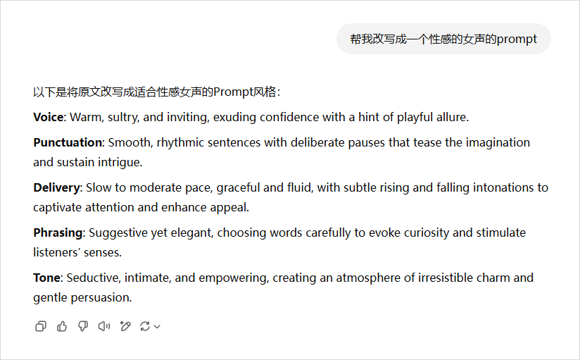 所以我们是能看到,有5个可以自己去捏的参数。你可以随便自定义。但是这玩意,说实话写起来也非常麻烦,我试了一下后,不如直接交给AI,这玩意谁特么手搓啊= =几秒钟,一段定制好的prompt就OK了,我们扔到之前的网页里。再用一段我很喜欢的《反叛的鲁鲁修》里面的台词去试一下。在价格上,gpt-4o-mini-tts是$0.015/分钟,大概1毛钱人名币1分钟,说实话,已经几乎是最低价了。Minimax已经算是价格屠夫了,大概也要1毛8人民币1分钟。如果你是开发者,想知道怎么接入,一切都在他们的API文档里。