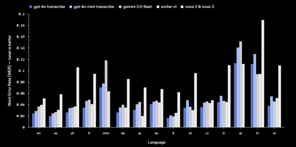 根据OpenAI提供的数据,GPT-4o Transcribe在英语基准测试中,错误率不到3%。