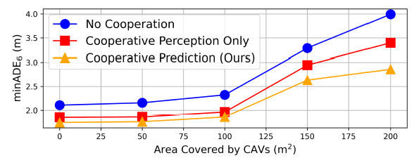 大范围场景效果更明显:进一步根据 CAV 在场景中的散布显示,随着协同车辆覆盖区域扩大(>200 m²),CMP 的预测精度提升高达 28.4%,充分验证其在大范围复杂场景中的优势。