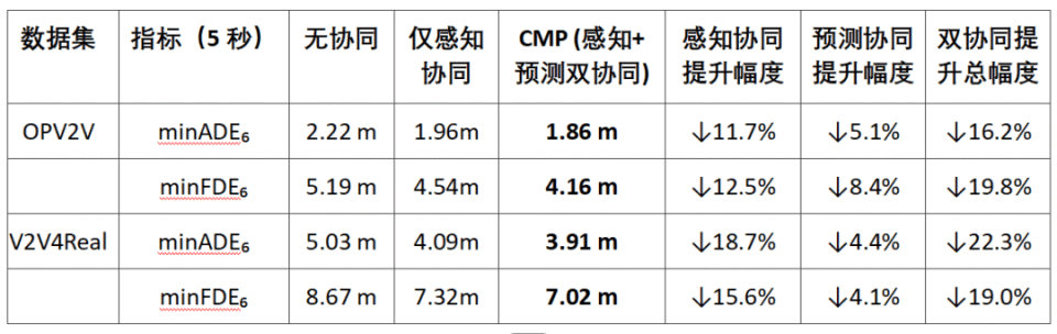 协同感知贡献显著:仅启用协同感知(不叠加预测聚合),预测误差较无协同降低 10%-15%,证明多车数据融合可有效扩展感知边界。
