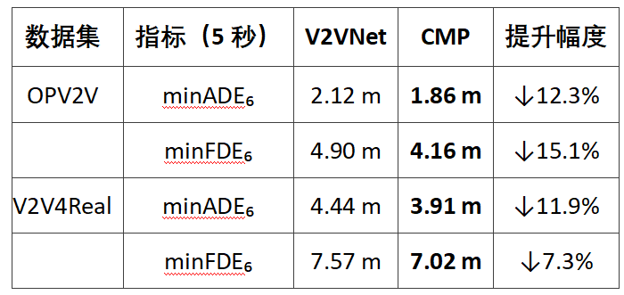 在 5 秒长时预测任务中,CMP 凭借协同感知 - 预测联合优化,显著优于现有方案 V2VNet: