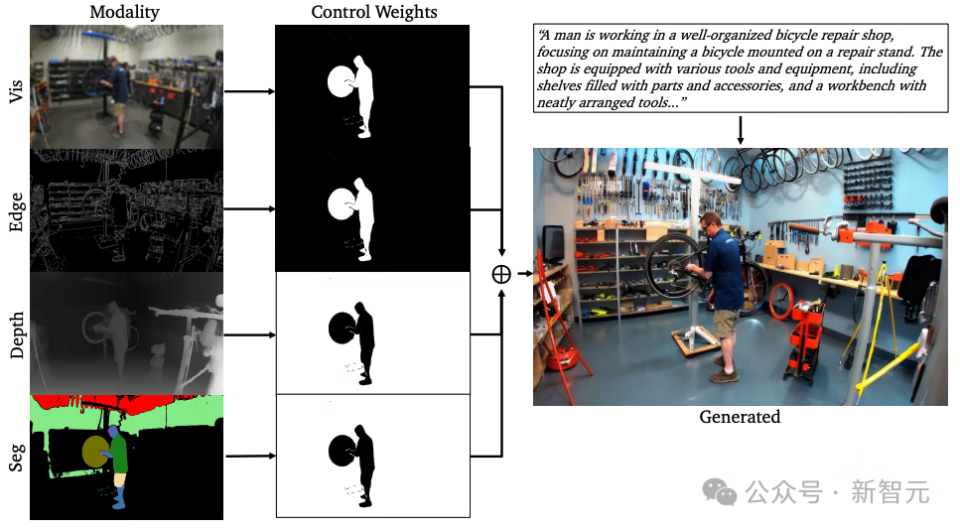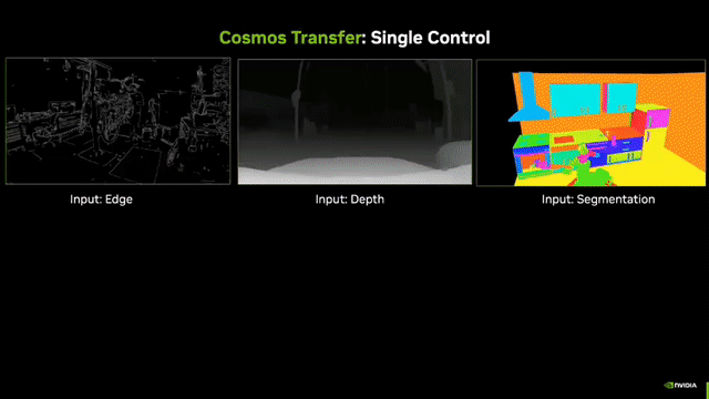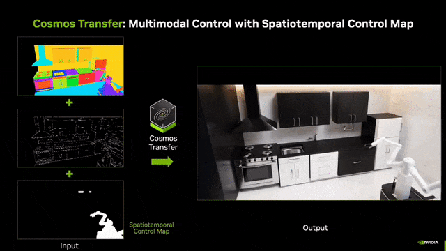 Cosmos Transfer不仅可以通过单一模态控制生成,也允许在不同的空间位置对不同的条件输入进行不同的加权。