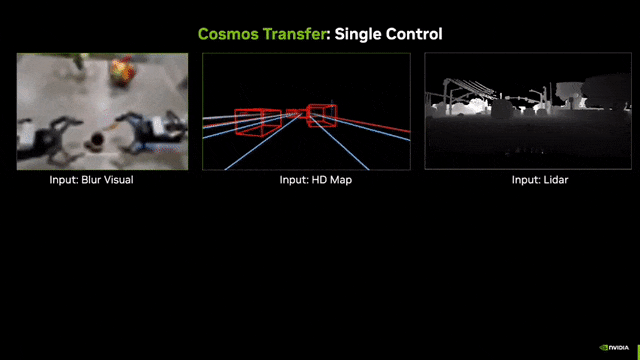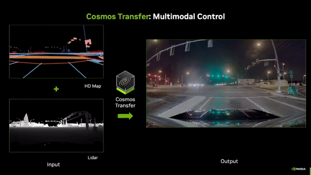真实物理世界就是以多种模态被感知的,比如上图中的四个模态:RGB Camera、Lidar雷达图、Depth深度图和HD Map高清地图。Cosmos Transfer使得高度可控的「世界生成」成为可能,并在各种世界到世界的转换用例中找到应用,包括Sim2Real(虚拟模拟世界向现实世界转换)。Cosmos Transfer强大的「世界生成」能力