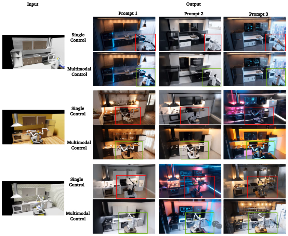 以下是Modern现代风格、Bakery风和Sci-Fi科幻风格。机械臂的模拟视频可生成Factory工厂风格、Construction Site建筑场景风格和Living Room起居风等。不论是单一模态、多模态还是生成各种风格的视频,Cosmos Transfer都表现出不俗的能力。「世界生成器」Cosmos Transfer1技术路线