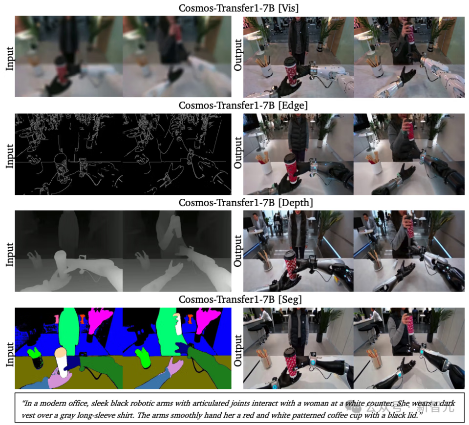 以上展示使用相同提示在各个单独模态(Vis、Edge、Depth、Seg)设置下,Cosmos-Transfer1-7B的生成视频效果。