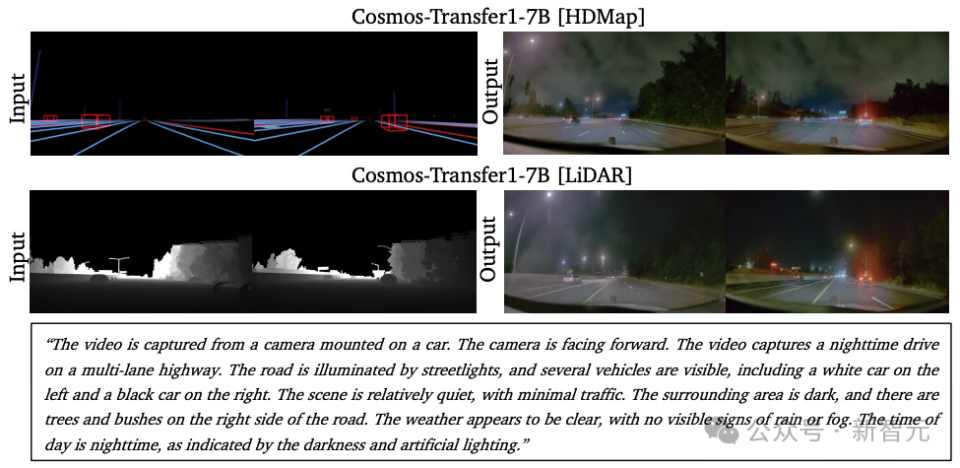在Cosmos-Transfer1模型设计中,空间条件方案是自适应和可定制的。它允许在不同的空间位置对不同的条件输入进行不同的加权。通过输入HD Map和Lidar雷达图,可以生成应用于自动驾驶训练的真实视频。在多模态的基础上,Cosmos Transfer1还引入了Spatiotemporal Control Maps时空控制权重图,控制权重图在黑色像素区域为0.0,在白色区域为0.5,所以在右侧生成的视频中,权重高的部分效果更加明显。![]()