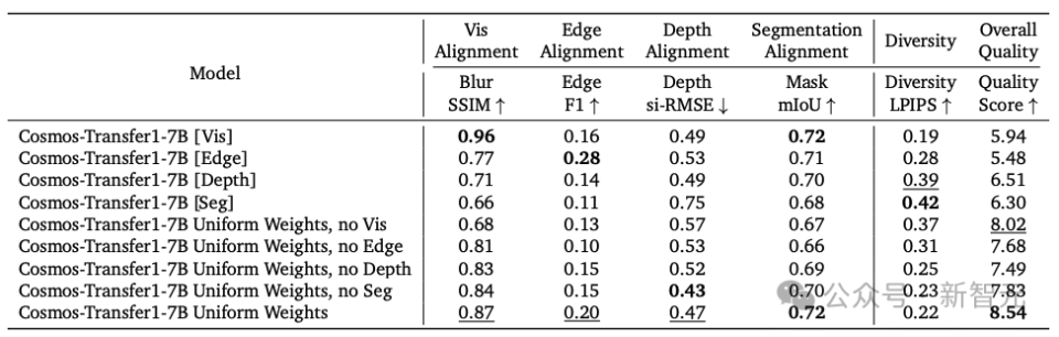 对各种Cosmos-Transfer1配置在TransferBench上的定量评估,考虑所有模态的模型获得了最高的Quality Score。其次,对不同模式(Vis、Edge、Depth 和Seg)的考虑不同的权重进行研究。控制权重在黑色像素区域为 0.0 ,在白色区域为 0.5 。注意到,虽然标题大致指定了一个自行车修理店的场景,但由于这些像素受到 Vis 和 Edge 的控制,蓝色衬衫上的白色标志和男子的肤色保持不变。另一方面,对于由 Depth 和分割控制的背景,物体在场景中的位置保持一致,但其颜色和纹理被随机化(例如红色工具箱、黄色三脚架、白色修理架)。模型还在右侧墙上添加了一个新的工具架。另一个例子是Cosmos-Transfer1在机器人数据生成中的示例结果。左列显示由NVIDIA Lab生成的基于物理引擎的虚拟输入视频,而右边三列则展示了使用不同提示词在单模态和多模态控制下的Cosmos-Transfer1-7B生成结果。![]()