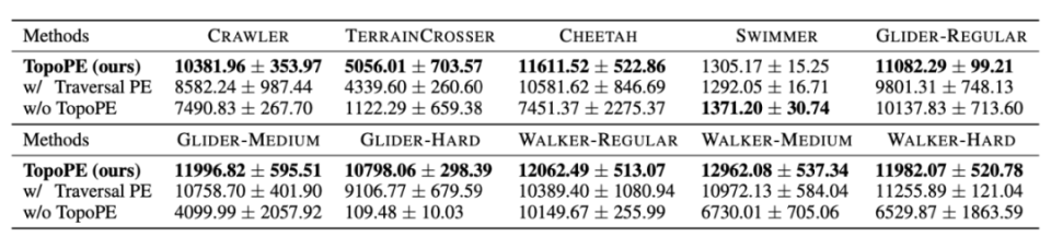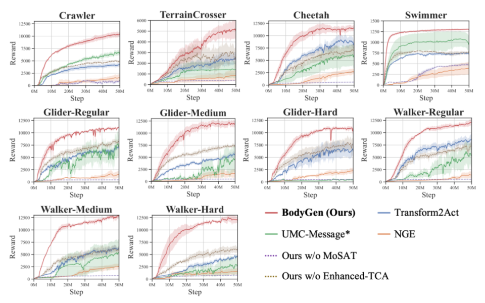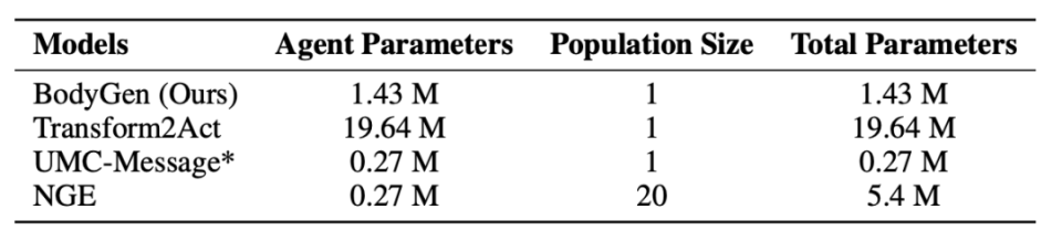 设计一个好的机器人形态可能要等很久才知道效果好不好(比如设计了长腿,要等机器人学会走路才知道这设计是否合理)。BodyGen 通过特殊的「奖励分配机制」,让 AI 能够合理评估自己的设计决策,不会因为短期效果不明显就放弃可能很好的设计。在人脑中,来自身体不同区域的信号会被传输到特定的神经区域进行处理,这隐含了消息来源的位置信息。对于机器人,我们同样需要高效的形体信息表征。在 BodyGen 中,拓扑感知位置编码(TopoPE)通过哈希映射,将机器人肢体到根肢体的路径映射为唯一的嵌入(Embedding),有效解决了形体演化过程中的索引偏移问题,从而促进了协同设计过程中相似形态机器人的知识对齐和共享。为了通用表征形体空间中的各种各样的机器人,作者使用标准序列模型 Transformer 处理拓扑结构可变的机器人形体。机器人的每一个关节信息都会经过「编码」-「集中处理」-「解码」三个阶段,最终生成动作信号:信息编码:来自不同肢体的信息首先会携带其拓扑位置信息首先通过编码层进行信号编码集中处理:这些编码后的信息借助 Transformer 网络进行点对点的信息通讯,实现集中式的信息交互和处理信息解码:最终,这些信息经过解码网络解码,从而获得机器人的动作信号在 BodyGen 的定义中,智能体具有两类基本动作:形态设计动作和形体控制动作。形态设计动作包含三类基本元动作:同时形体控制动作包含机器人与环境交互每一个关节马达的输出力矩。本研究使用近端策略优化算法(PPO)进行端到端的协同设计训练优化。相较于形体控制动作,形态设计动作无法获得及时的环境反馈。作者提出改进的广义优势估计(GAE),层次化地对环境奖励进行动态分配,从而使智能体在形态设计和控制阶段获得平衡的优势估计,从而提升训练性能。BodyGen 测评效果:参数低至 1.43M,实现 60% 性能提升研究者选取了 3 种基础的机器人拓扑结构(线性、双腿、四腿),在不同的仿真环境中,环境奖励信号仅为运动敏捷性(指定方向的运动速度)。给定初始结构设计,借助 BodyGen 进行形态-控制协同优化。作者在 10 个不同类型的环境进行了综合测评,实验表明,BodyGen 相对于最先进的基线实现了 60.03% 的平均性能提升,在 10 个不同任务种类的环境下(如爬行、地形穿越、游泳等),BodyGen 生成的机器人形态相比于现有最优方法(如 Transform2Act、NGE 等)在环境适应性评分获得了 60.03% 的涨幅。研究对序列模型、时序信用分配算法进行了充分的对比消融,对文章提出的 MoSAT 架构和时序信用分配算法的进行了详细和充分的实验验证。作者同样对形体结构位置编码进行了消融实验,证实 TopoPE 在形态表征上的有效性。BodyGen 的平均参数量为 1.43M,相较于其他基线算法更加轻量级。BodyGen 的紧凑设计使其在保持生成能力的同时,显著降低了计算成本和存储需求,提升了训练的稳定性与效率。这种高效的模型架构不仅减少了训练时的资源消耗,还提升了推理阶段的响应速度,使其更适用于资源受限的环境,甚至可在一台笔记本上借助 CPU 进行高效推理。BodyGen 作为一个通用形体-控制协同设计算法,展现出了一定的应用潜力,包括但不限于:- 环境适应性机器人设计:针对特定环境需求,快速生成最优形态与控制策略,显著缩短机器人设计周期,提升开发效率;