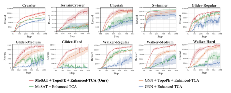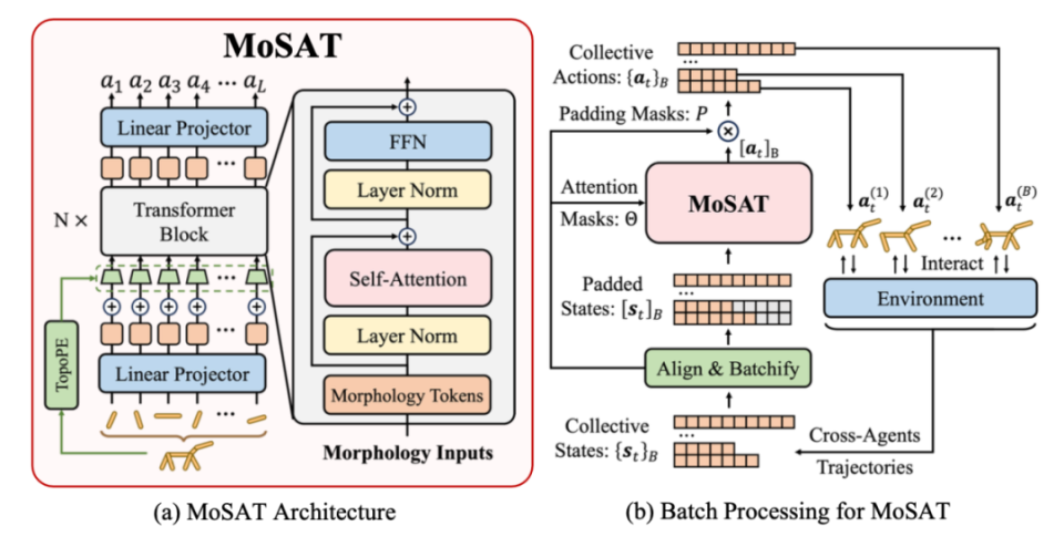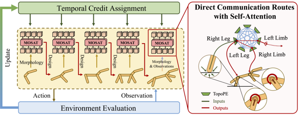 本文研究探索了一个有趣但引人深思的问题:机器人能否像生物一样自主进化?团队通过实验给出了肯定答案:结合强化学习与深度神经网络技术,BodyGen 能在极短时间内自动演化出适应当前环境的最优机器人形态及控制策略,为具身智能的加速进化提供了全新的思路。据了解,本届大会共收到 11672 篇论文,被选中做 Spotlight(聚光灯/特别关注)或者 Oral Presentation(口头报告)的比例约为 5.1%。自然界生物通过数百万年的进化,获得了适应环境的完美身体结构与环境交互能力。然而,机器人的设计不但需要极其庞大的人类专家知识,且针对特定环境需要进行大量的实验、设计和迭代。受自然界生物学启发,科学家提出形态控制协同设计(Co-Design)技术:让机器人模仿生物进化过程,在优化控制策略(大脑)的同时演化自身形态(形体结构、关节参数)从而适应复杂环境。然而,这一领域长期面临两大难题:一是形体搜索空间巨大,在有限时间内难以穷举所有可能的机器人形态;二是机器人形态与控制策略深度耦合,评估每一个候选形态设计需要大量计算资源。来自清华大学与蚂蚁数科的研究团队提出 BodyGen 框架,利用强化学习实现了端到端的高效形态-控制协同设计。在这项工作中,将形体设计过程划分为两个连续阶段:形态设计阶段、环境交互阶段。在演化阶段:研究引入 Transformer(GPT-Style)自回归地构建机器人的形体结构并优化参数;在环境交互阶段,同样使用 Transformer(Bert-Style)对机器人的每一个关节信息进行集中处理并发送到对应关节马达,与环境交互并获得反馈。在几轮的迭代后,BodyGen 可以快速生成当前环境的最佳机器人形态和相应的控制策略。BodyGen 是一个生物启发式的训练框架,它使用深度强化学习进行端到端的形态-控制协同设计。BodyGen 包含三项核心技术点:TopoPE 就像机器人的「身体感知」系统,通过给机器人每个部位贴上「智能标签」。无论机器人的形状如何变化,这些标签都能帮助 AI 理解「这是腿」、「这是手臂」等。这样,即使机器人的形态发生变化,AI 也能快速适应并控制新的身体结构。(2)基于 Transformer 的集中式的神经中枢处理网络 MoSATMoSAT 就像机器人的「大脑中枢」,它的工作方式很像人脑:- 信息收集:首先收集机器人各个部位的信息(位置、速度等)