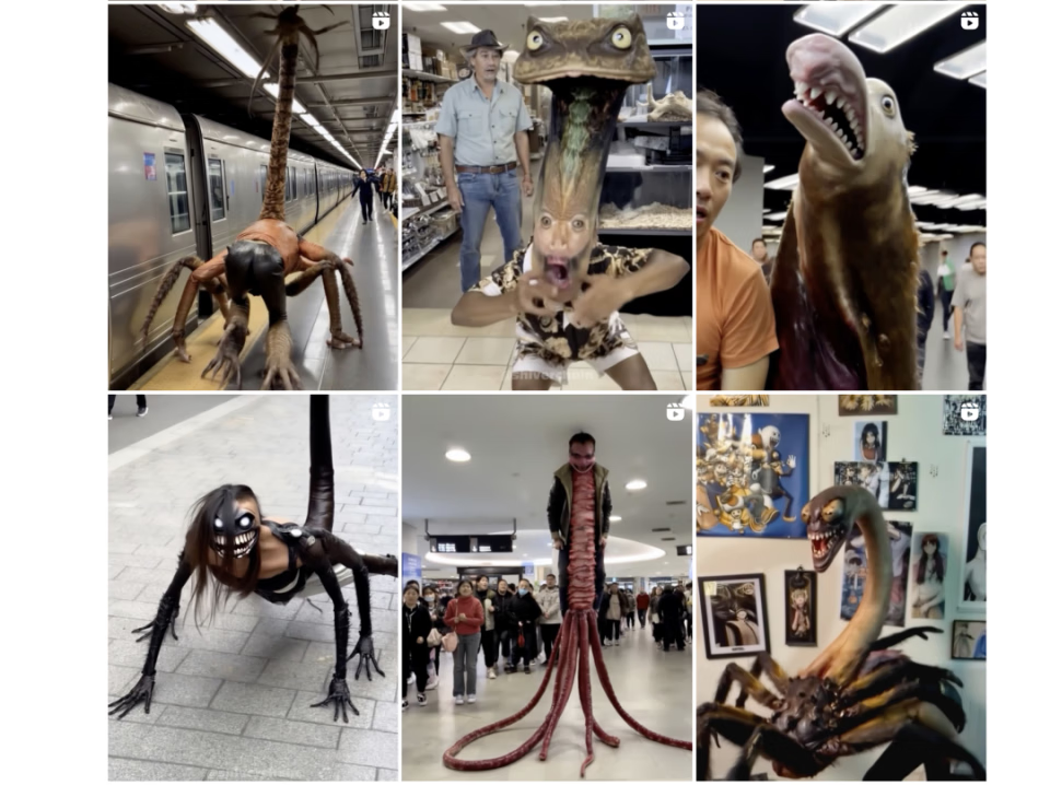 而这类视频和其他 AI 短视频不同之处在于:在画面上极度诡谲和猎奇。它已经跳出了 AI 和现实擦边的恐怖谷,而是在普通的生活场景里,突然让人畸变,长出异常的肢体,变成不可名状的怪物,
