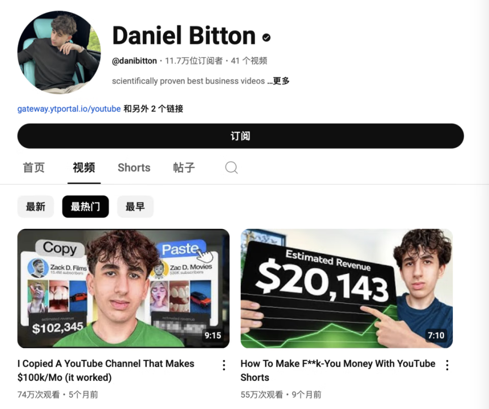 点开这名 YouTuber 的主页,他有 11.7 万订阅者,最火的一条视频《我复制粘贴一个 YouTube 频道,让我每个月赚到 10 万美元》有 74 万播放量。这条视频的主旨就是:雇人做内容太贵了,我们决定用 AI 复制爆火视频。