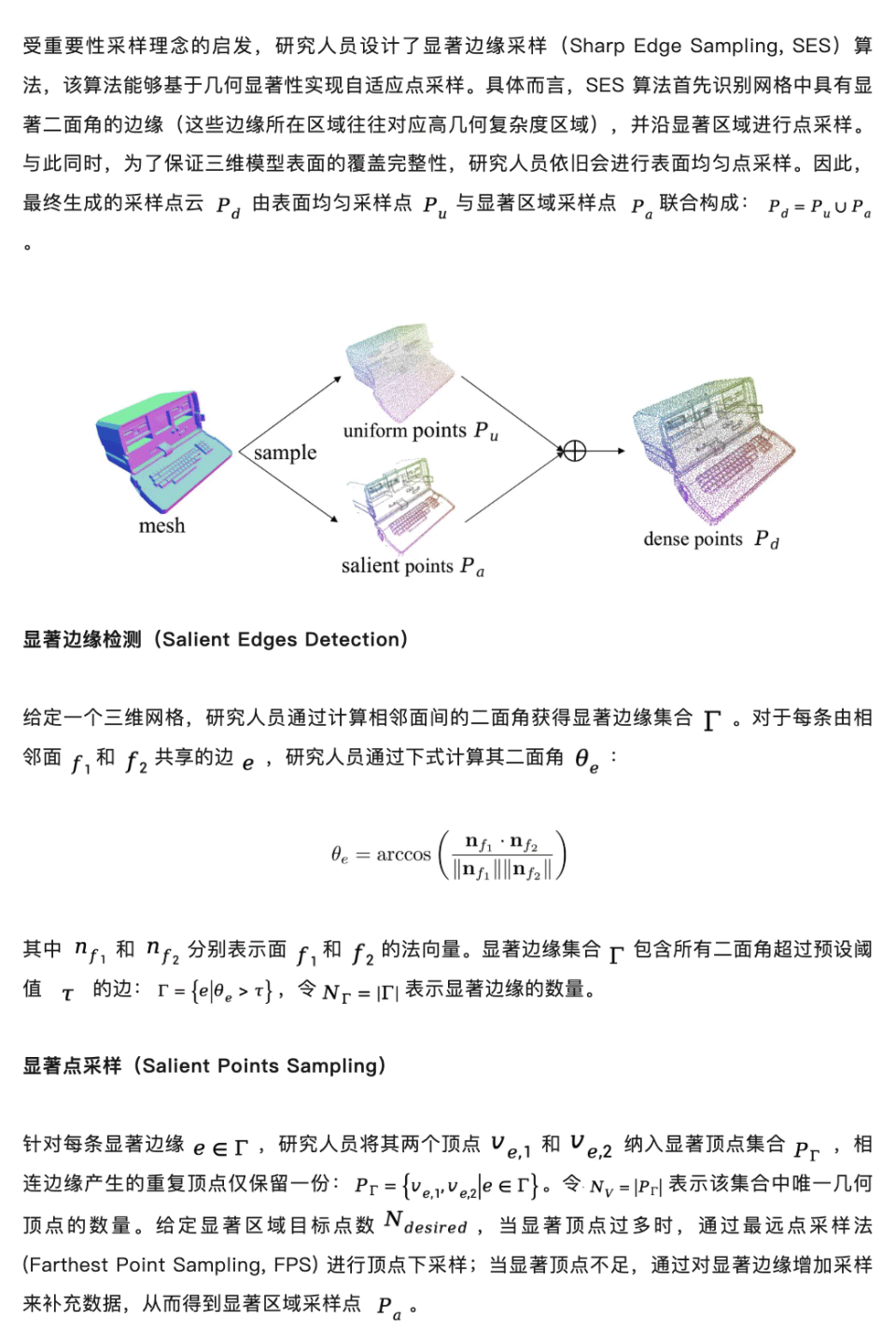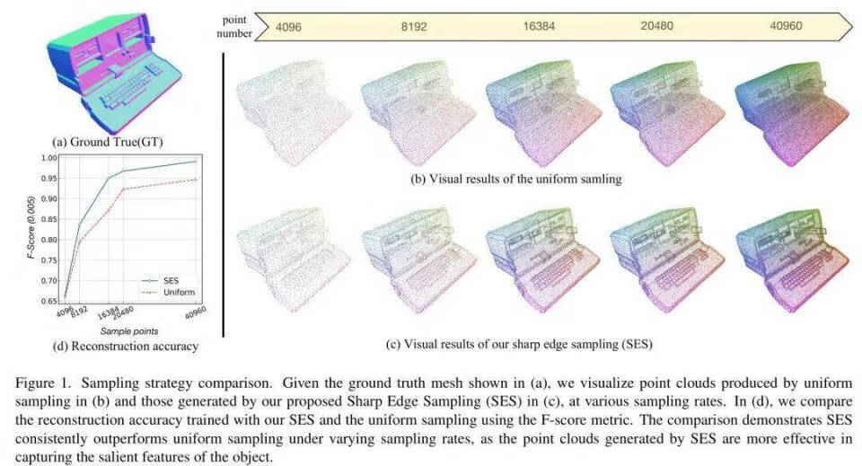 当前,三维变分自编码器的运行机制是:通过在三维网格表面进行点采样来完成形状编码,而后利用解码器对原始三维网格进行重建。经过深入且细致的研究,研究人员察觉现有方法普遍采用均匀采样(uniform sampling)策略,从而导致重建性能受限。为了验证这一发现,研究人员选取了具有复杂几何细节的键盘(如下图 (a) 所示)作为实验对象,对其进行点云采样,并将不同采样策略在多种采样密度下的点云分布情况进行了可视化呈现(如下图 (b)(c) 所示)。实验结果清晰地显示:即便提升了采样率,采用均匀采样方式(如下图 (b) 所示)依旧无法有效地保留键盘按键等锐利特征(sharp feature)。这一简洁直观的实验有力地证实了,均匀采样在本质上对几何细节的捕捉能力形成了制约,而这种制约进一步对变分自编码器的重建精度以及所训练扩散模型的生成质量产生了不良影响。