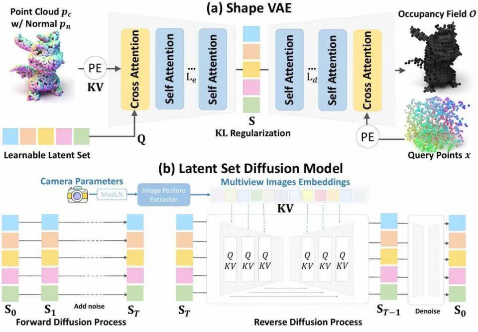 团队提出了将三维扩散模型与多视图扩散模型相结合的原生三维生成方案。具体来说,算法使用 3D-VAE 将几何压缩到潜在空间,然后使用 3D-DiT 扩散模型在潜在空间进行生成。对于单个参考图像或文本提示输入,首先将其输入到多视图扩散模型中以获得多视图图像作为三维扩散模型的输入,然后使用三维扩散模型从中学习生成三维几何图形。