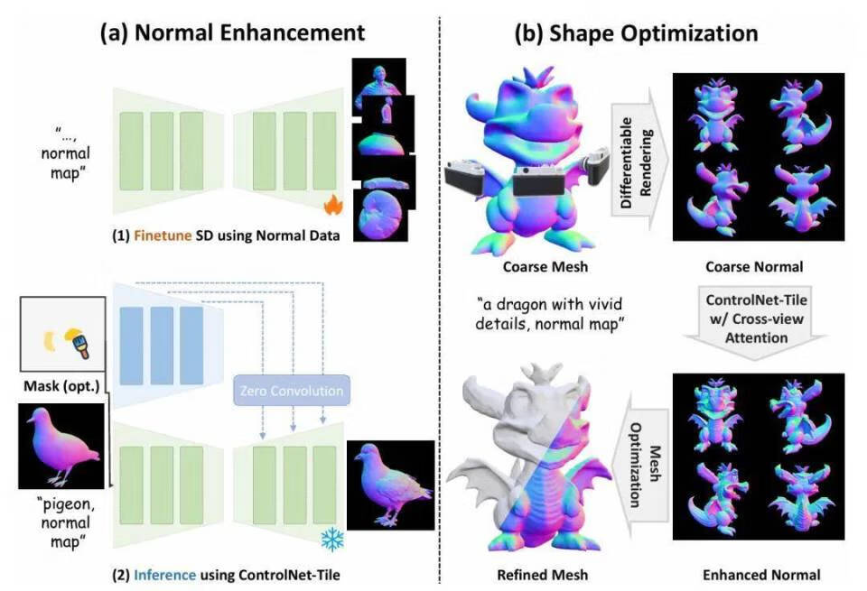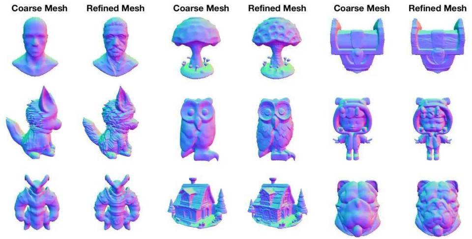 具体来说,该部分通过基于表面法线贴图的扩散模型来实现法线图细节增强,并通过显式三角网格优化增加三维几何细节。团队在原版 stable diffusion 的基础上使用法线数据集微调,并借助 tile 插件实现法相贴图的超分辨率生成。通过这种方式模型既拥有几何细节生成能力,还保留了原有的泛化能力。进一步基于法线贴图优化直接优化三维网格顶点,只需 10 秒,即可在用户绘制的区域添加几何细节,并完全保持其他区域的几何形状。