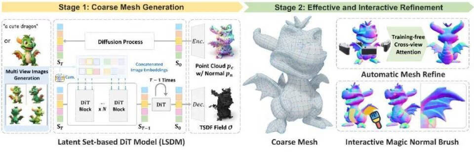 在 3D-VAE 模型的基础上,香港科技大学与光影焕像团队进一步提出了 Craftsman3D 算法方案,该方案借鉴了传统建模流程,能够快速生成高质量的 3D 模型,以进一步生成满足设计师对高质量三维模型的生成要求。此方法在 CVPR 中获得审稿人一致满分评价,它融合了原生 3D 大模型以及实时几何细节优化两大部分:首先由原生三维大模型生成初始模型,随后通过实时可交互几何细化操作,短短几十秒内即可生成具备高质量几何细节的三维模型。