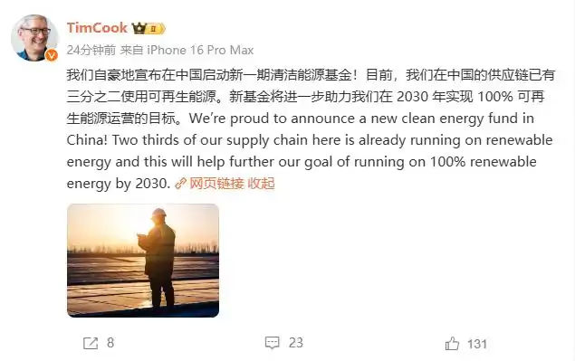 当日,苹果公司CEO库克在社交平台发文,对上述事项作出回应。库克表示,目前苹果公司在中国的供应链已有三分之二使用可再生能源,新基金将进一步助力公司在2030年实现100%可再生能源运营的目标。