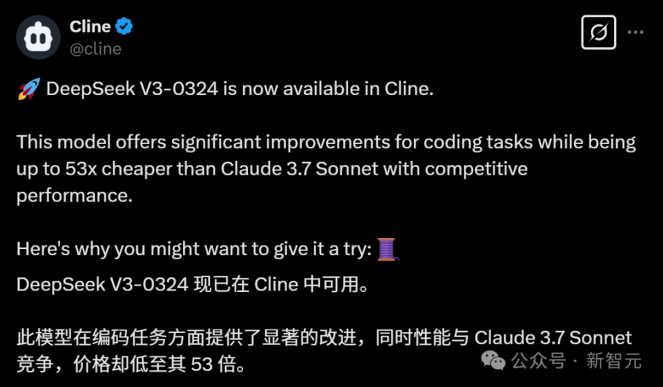 编码智能体Cline的速度很快,第一时间更新了DeepSeek-V3-0324。