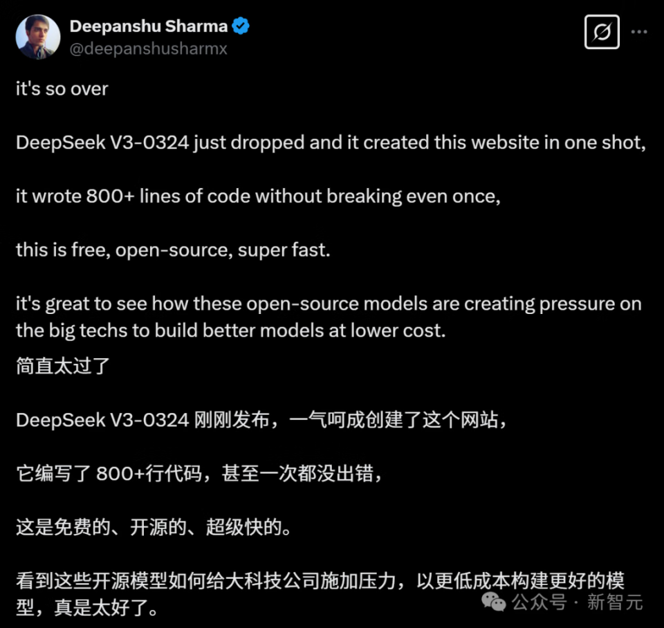 「看到这些厉害的开源模型不断给大公司施加压力,迫使他们以低成本构建更好的模型,真是太棒了!」Deepanshu写道。