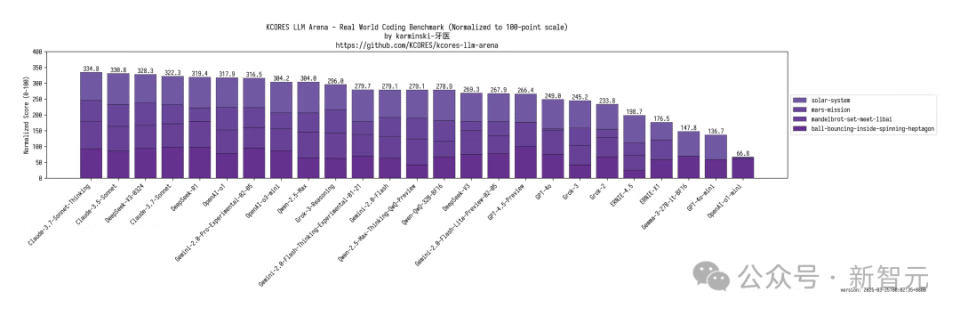在 KCORES大模型竞技场中,Claude-3.7-Sonnet-Thinking无疑是LLM当之无愧的王者,DeepSeek-V3-0324以328.3分拿下第三名,仅次于Claude 3.5 Sonnet。