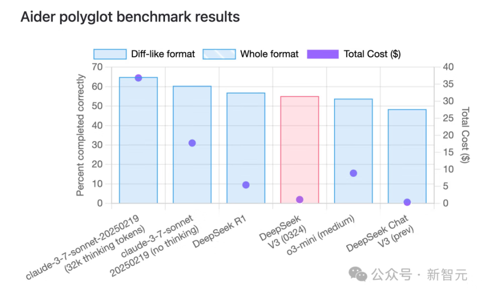 另外,在Aider的多语言基准测试中,DeepSeek-V3-0324拿下55%成绩,较前代版本显著提升,成为仅次于Sonnet 3.7的非推理类模型第二名。
