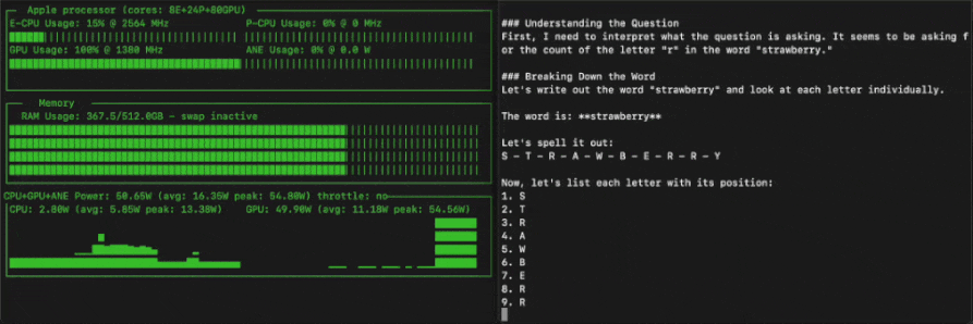 这不,苹果机器学习工程师Awni Hannun就基于MLX框架和4-bit量化,在512GB M3 Ultra实现了超过20 token/s的运行速度。