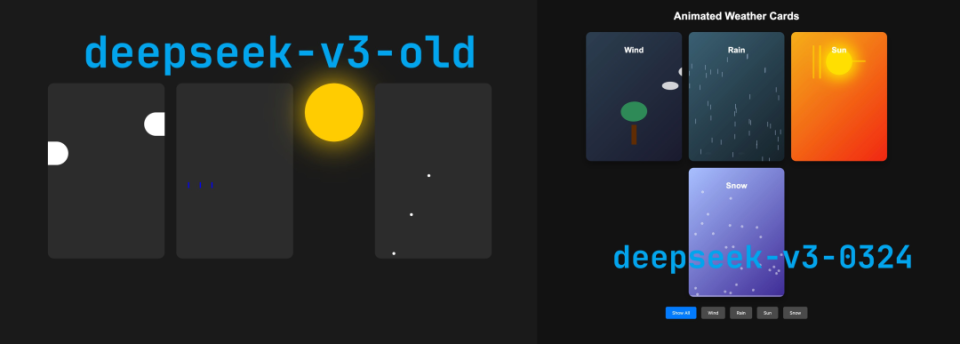 作者:张勇毅和上周不少朋友期待的一样,新一周第一天的北京时间 3 月 24 日晚,DeepSeek 果然「突然」发布了模型更新。但暂时还不是 DeepSeek V4 或 R2,而是 DeepSeek V3 模型的一次更新。目前,其开源版本目前已经上架开源网站。其开源版本模型体积为 6850 亿参数。深度求索微信官方公众号也确认,本次更新属于小版本升级,目前已经在官方网页、App 小程序等入口开放。初代 V3 模型最为人所熟知的,可能还是「557.6万美金比肩Claude 3.5效果」的超级性价比。而更新后的模型由其新的 32KGPU 集群上改进的后训练提供支持。截至目前,还没有任何关于新版 DeepSeek V3 的能力基准测试榜单出现,但有了 DeepSeek V3 发布即成为 Chatbot Arena 榜单前十中唯一一个开源模型的刷榜历史,还是在发布一小时后迅速吸引来全球用户对其测试体验。根据目前最新的用户上手测试,新版 V3 模型前端编码能力的提升,是目前「感知最强」的部分。根据专业用户对新版 V3 的综合体验判断,V3-0324 的提升幅度大约相当于 Sonnet 3.5 到 Sonnet 3.6 的提升。用户按照下面的提示词,同时对新版 V3 与 R1 下达任务,实际产出的效果已经出现巨大差异。创建一个包含 CSS 和 JavaScript 的单个 HTML 文件,以生成一个动画天气卡片。卡片应通过不同的动画直观地表示以下天气条件:风:(例如,移动的云朵、摇曳的树木或风线)雨:(例如,落下的雨滴、形成的水坑)晴:(例如,闪耀的光线、明亮的背景)雪:(例如,落下的雪花、积雪)并排显示所有天气卡片。卡片应具有深色背景。在此单个文件中提供所有 HTML、CSS 和 JavaScript 代码。JavaScript 应包含一种在不同天气条件之间切换的方法(例如,一个函数或一组按钮),以演示每种天气的动画。左侧是 DeepSeek 新版 V3 模型的生成结果,右侧为 R1 的生成结果。除了对比 R1 ,用户还用类似的提示词,对比了 Claude 系列。Claude 3.7 作为目前号称「编程能力最强模型」,实际编程能力使用体验也是多次被评为「已经达到专家级程序员水准」。同一提示词给到 Claude 3.5/3.7 后,模型生成的前端内容如下所示:除了这个测试案例,根据更多用户对之前 prompt 测试的结果,普遍结论是当前新版 V3 在编码能力已经接近claude3.7 ,同时也是目前第一时间上手中,大家觉得比之前的 v3 能力提升最大的部分。针对前端网站搭建测试,新版 V3 所生成的网站(上)在与 Claude 3.7 Sonnet 生成的结果(下)中,也快速「拉齐」了网站的构建效果除了编程能力,在其他用户的测试中,新版 V3 在多轮对话中体现出了更强的上下文理解能力。当然,与往常一样,DeepSeek 也没有同时公开表示 R2 或者 V4 模型会在何时发布,但不少用户在体验过新版 V3 后,都觉得似乎 R2 的到来,也已经不远了。还有一个普通用户「感知不强」,但让开源社区非常兴奋的改变。新版 V3 的开源许可与 R1 一样,也更新变成了 MIT 开源许可(MIT License),这意味着新版 V3 有着比初代 V3 更宽松的开源使用条件。并且 MIT 开源许可一向以商业友好而著称,使用MIT许可的项目可以与商业和专有软件集成,这或许对于希望在商业项目中使用新版 V3 模型的开发者来讲,是本次更新最重要的改变了。*头图来源:DeepSeek