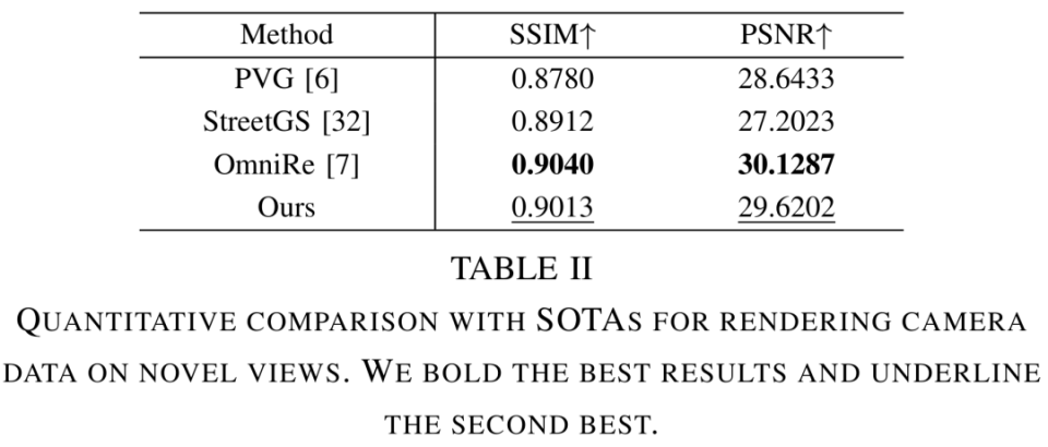 如表二所示,对于图像,该方法能保持高质量的渲染质量。此外该方法在新视角下也能表现出优越的泛化性能。
