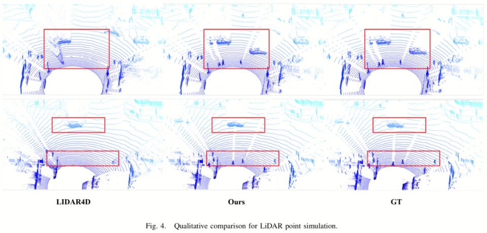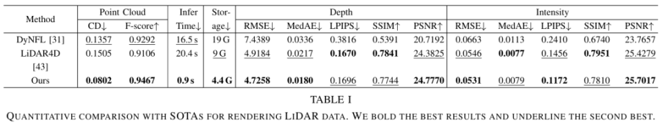 表一,展示该方法和 lidar 仿真 SOTA 方法的定量比较。加粗为最优结果,加下划线为次优结果。和之前的 SOTA 方法相比,该方法在所有指标上均表现出卓越的性能。证明了这种联合仿真的优势。与 DyNFL 和 LiDAR4D 相比,该方法的 CD 指标分别降低了 40.9% 和 46.7%,同时渲染耗时和计算内存消耗也大幅降低。下面图 3 和图 4 展示可视化效果,该方法能够准确而精细地模拟动态驾驶场景中的各种类型的可移动实体,展现出明显优势。