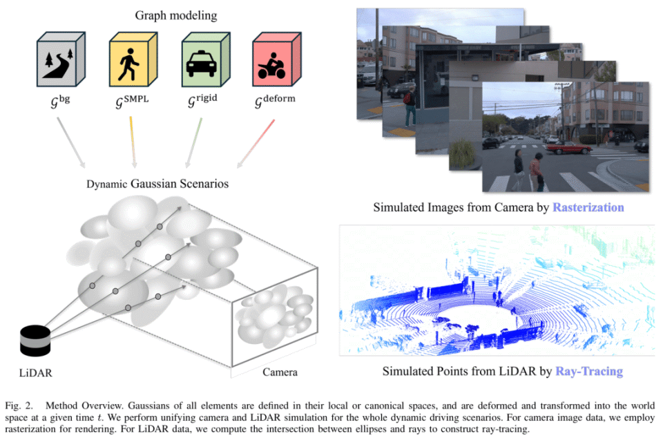 如图二所示,对于一个动态驾驶场景,该方法建立一个高斯场景图来进行解耦建模,其中包含静态背景和各种运动物体,例如刚性的车辆和非刚性的行人、骑车人。方法对整个场景进行相机和激光雷达同时的模拟。对于相机图像数据,方法采用 2D 高斯基元(2D Gaussian primitives)的栅格化渲染。对于激光雷达数据,计算高斯球和射线的交点并构建光线追踪来进行模拟,结合反射强度(SH intensity)与射线丢弃概率(SH ray-drop probability)建模 LiDAR 的主动感知机制。