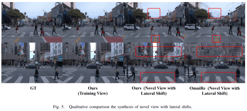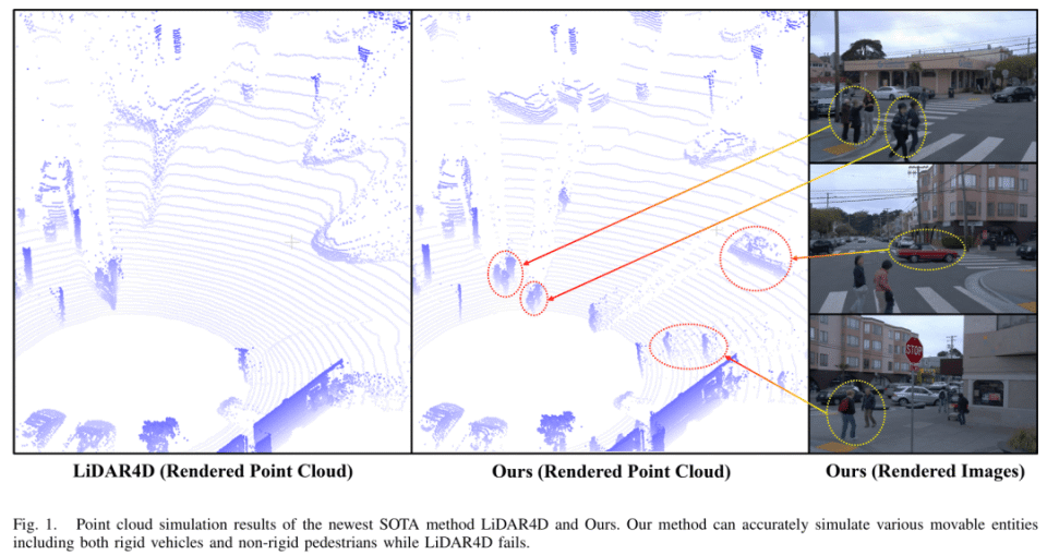 图一展示了最新 SOTA 方法 LiDAR4D 和该方法仿真结果的对比。相比之前方法,该方法可以准确地重建出各种可移动物体,包括行人和车辆。同时该方法对图像也可以进行高质量的重建。