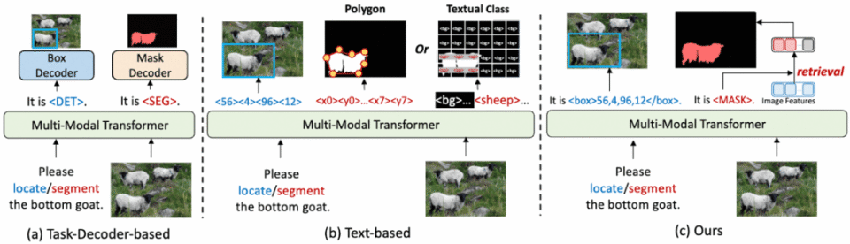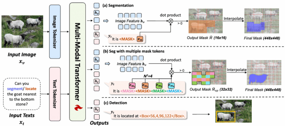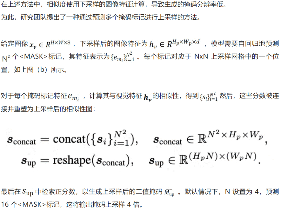 为此,研究团队提出了基于特征检索的方式来支持分割:模型通过预测<MASK>标记,计算其特征与图像特征的相似度实现分割。