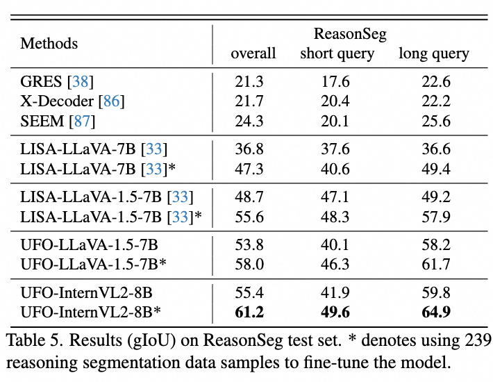 推理分割要求模型进行深层推理得出分割目标,更加困难。UFO 可以深度融合文本推理和分割能力,性能超过基于 SAM 的 LISA。
