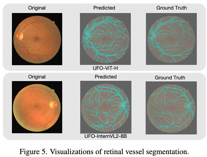 视网膜血管形状不规则且狭窄,难以用多边形表示。UFO 在 DRIVE 上进行了训练,取得了 77.4 的 Dice 系数,验证了在极细粒度结构上的有效性。