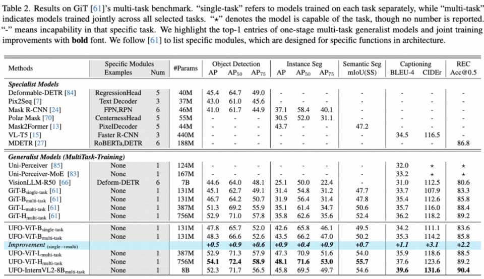 UFO 在 GiT 提出的多任务基准上取得显著提升,在 COCO 实例分割上相比 GiT-H 提升 12.3 mAP,在 ADE20K 语义分割上提升 3.3 mIoU。