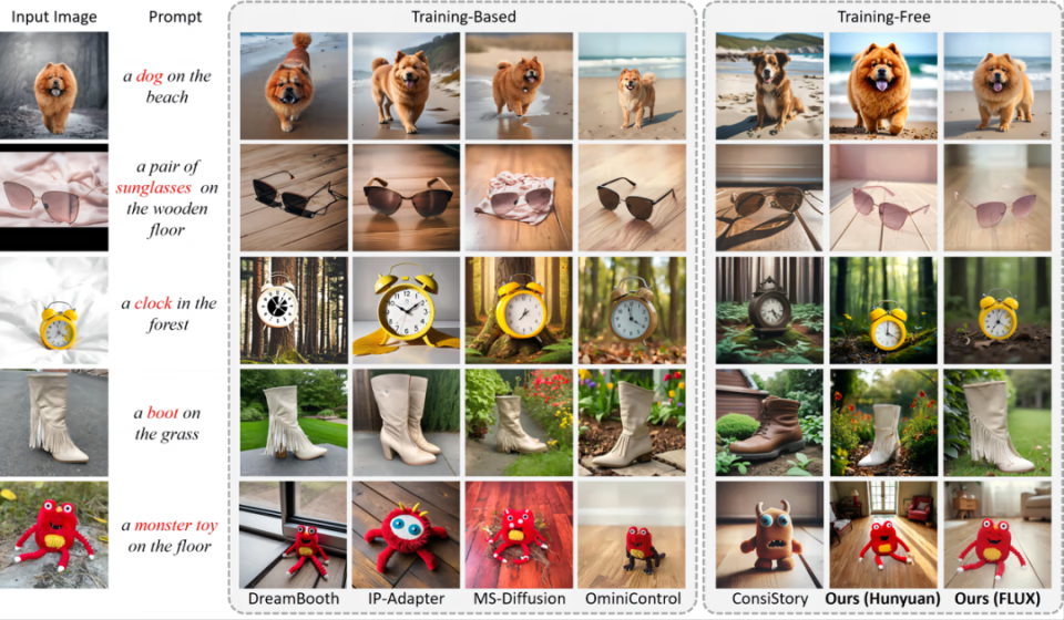 高效的免训练框架:无需训练,具备较高的计算效率,仅需一次反演(inversion)和一次推理过程 高保真度与可控性:在保持高精度细节的同时兼顾了物体姿态的多样性,并支持位置控制 高扩展性:同时支持多种任务,包括多物体处理、物体与场景的整合、inpainting 和 outpainting 等