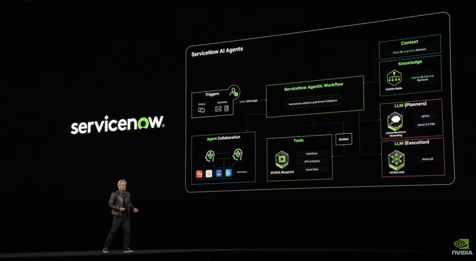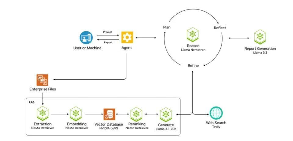从性能上看,49B的Llama Nemotron Super 在各项指标中都超过了70B的经DeepSeek R1蒸馏过的Llama 70B模型。不过考虑到最近Qwen QwQ 32B模型之类的小参数高能模型频繁发布,Llama Nemotron Super 估计在这些能和R1本体掰手腕的模型里难以出彩。最要命的是,这个模型,等于实锤了DeepSeek也许比英伟达更懂在训练过程中调教GPU。3)新模型只是英伟达AI Agent生态的前菜,NVIDA AIQ才是正餐英伟达为什么要开发一个推理模型呢?这主要是为了老黄看中的AI下一个爆点——AI Agent做准备。自从OpenAI、Claude等大厂逐步通过DeepReasearch、MCP建立起了Agent的基础后,英伟达明显也认为Agent时代到来了。NVIDA AIQ项目就是英伟达的尝试。它直接提供了一个以Llama Nemotron推理模型为核心的规划者的AI Agent现成工作流。这一项目归属于英伟达的Blueprint(蓝图)层级,它是指一套预配置的参考工作流、是一个个模版模板,帮助开发者更容易地整合NVIDIA的技术和库。而AIQ就是英伟达提供的Agent模版。![]()