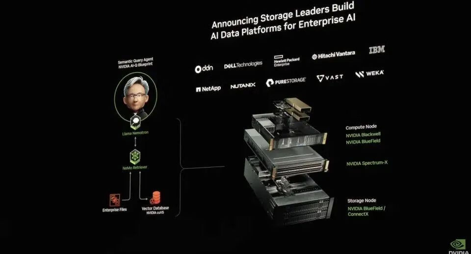 比Manus更进一步的是,它具有一个复杂的针对企业文件的RAG系统。这一系统包括提取、嵌入、向量存储、重排到最终通过LLM处理的一系列步骤,能保证企业数据为Agent所用。在此之上,英伟达还推出了AI数据平台,把AI推理模型接到企业数据的系统上,形成一个针对企业数据的DeepReasearch。使得存储技术的重大演进,使得存储系统不再仅是数据的仓库,而是拥有主动推理和分析能力的智能平台。AI Data Platform的构成