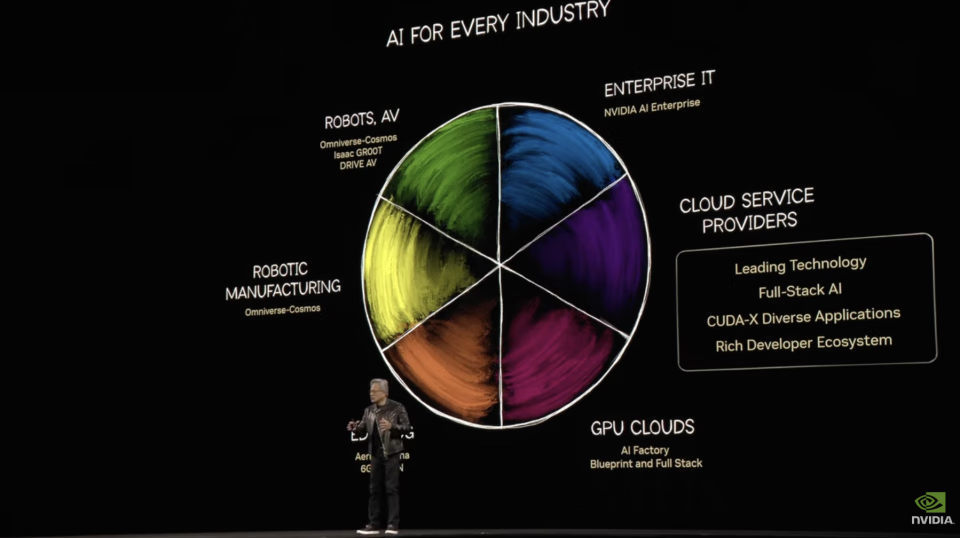 这套体系在本次GTC中又被老黄重提,且特别提到靠着这套算力系统,能诞生十亿级的机器人。从训练到部署,算力都用英伟达。这一部分也闭环了。如果单纯对比上一代Blackwell芯片,Blackwell Ultra在硬件上确实匹配不上之前的“核弹”、“王炸”这些形容词,甚至有些挤牙膏的味道。但如果从路线图规划的角度来看,这些又都在黄仁勋的布局之中,明年、后年的Rubin架构,从芯片工艺,到晶体管,再到机架的集成度,GPU互联和机柜互联等规格都会有大幅度提升,用中国人习惯说的叫“好戏还在后头”。对比硬件层面上的画饼充饥,这两年英伟达在软件层面上可以说是狂飙突进。纵观英伟达的整个软件生态,Meno、Nim、Blueprint三个层级的服务把模型优化、模型封装到应用构建的全栈解决方案都包括进去了。云服务公司的生态位英伟达AI全部重合。加上这次新增的Agent,AI infra这块饼,英伟达是除了基础模型这一块之外,所有部分都要吃进去。而在机器人市场,英伟达的野心更大。模型,数据,算力三要素都抓在手里。没赶上基础语言模型的头把交椅,基础具身智能补齐。影影绰绰,一个具身智能版的垄断巨头已经在地平线上露头了。这里面,每个环节,每个产品都对应着一个潜在的千亿级市场。早年孤注一掷的好运赌王黄仁勋,靠着GPU垄断得来的钱,开始做一场更大的赌局。如果这场赌局里,软件或者机器人市场任意一方面通吃,那英伟达就是AI时代的谷歌,食物链上的顶级垄断者。不过看看英伟达GPU的利润率,我们还是期待这样的未来别来了。还好,这对于老黄这辈子来讲,也是他从没操盘过的大赌局,胜负难料。![]()