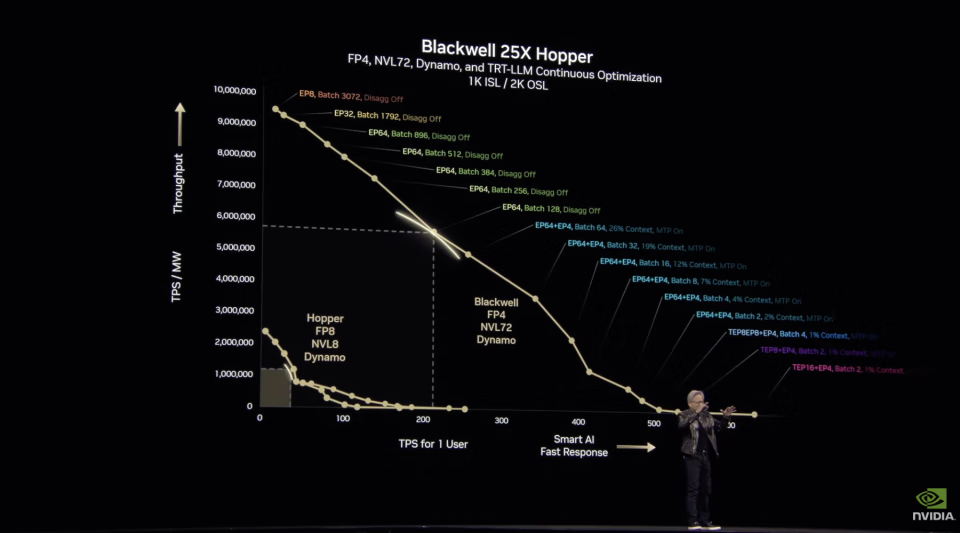 而对于GPU运营商来讲,这个改进使得每百万令牌成本显著下降,而产能大幅提升。同时单用户每秒获得更多token,响应更快,用户体验改善。