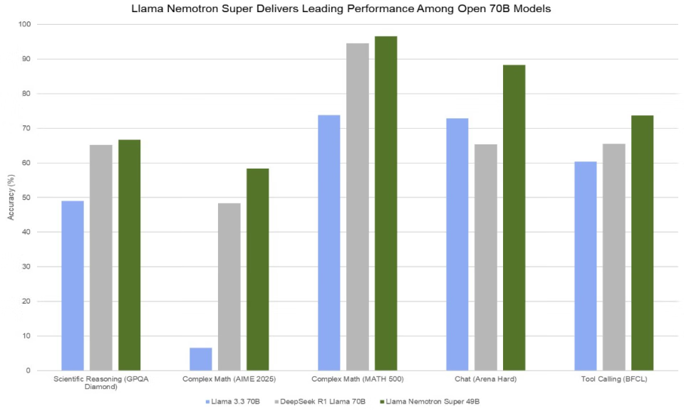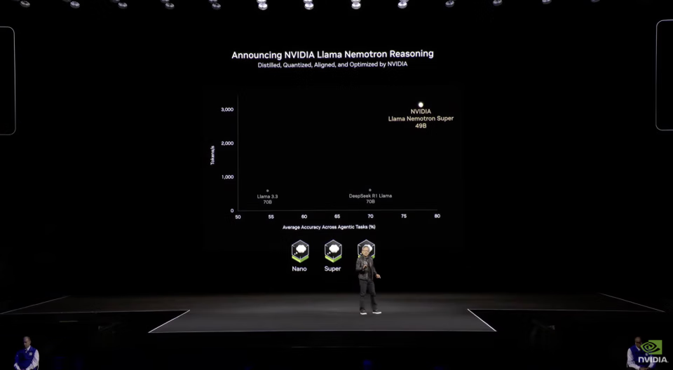 用Dynamo,让服务器达到吞吐量和应答速度间的黄金收益线与CUDA作为GPU编程的底层基础不同,Dynamo是一个更高层次的系统,专注于大规模推理负载的智能分配和管理。它负责推理优化的分布式调度层,位于应用程序和底层计算基础设施之间。但就像CUDA十多年前彻底改变了GPU计算格局,Dynamo也可能成功开创推理软硬件效率的新范式。Dynamo完全开源,支持从PyTorch到Tensor RT的所有主流框架。开源了也照样是护城河。和CUDA一样,它只对英伟达的GPU有效果,是NVIDIA AI推理软件堆栈的一部分。用这个软件升级,NVIDIA构筑了自己反击Groq等专用推理AISC芯片的城防。必须软硬搭配,才能主导推理基础设施。2)Llama Nemotron新模型秀高效,但还是打不过DeepSeek虽然在服务器利用方面,Dynamo 确实相当惊艳,但在训练模型方面英伟达还和真内行有点差距。英伟达在这次GTC上用一款新模型Llama Nemotron,主打高效、准确。它是由Llama系列模型衍生而来。经过英伟达特别微调,相较于Llama本体,这款模型经过算法修剪优化,更加轻量级,仅有48B。它还具有了类似o1的推理能力。与Claude 3.7和Grok 3一样,Llama Nemotron模型内置了推理能力开关,用户可选择是否开启。这个系列分为三档:入门级的Nano、中端的Super和旗舰Ultra,每一款都针对不同规模的企业需求。说到高效,这一模型的微调数据集完全英伟达自己生成的合成数据组成,总数约60B token。相比DeepSeek V3用130万H100小时完整训练,这个仅有DeepSeek V3 1/15参数量的模型只是微调就用了36万H100小时。训练效率比DeepSeek差一个等级。在推理上效率上,Llama Nemotron Super 49B模型确实比上一代模型表现要好得多,其token吞吐量能达到Llama 3 70B 的5倍,在单个数据中心GPU下它可以每秒吞吐3000 token以上。但在DeepSeek 开源日最后一天公布的数据中,每个H800 节点在预填充期间平均吞吐量约为73.7k tokens/s 输入(包括缓存命中)或在解码期间约为14.8k tokens/s 输出。两者差距还是很明显的。![]()