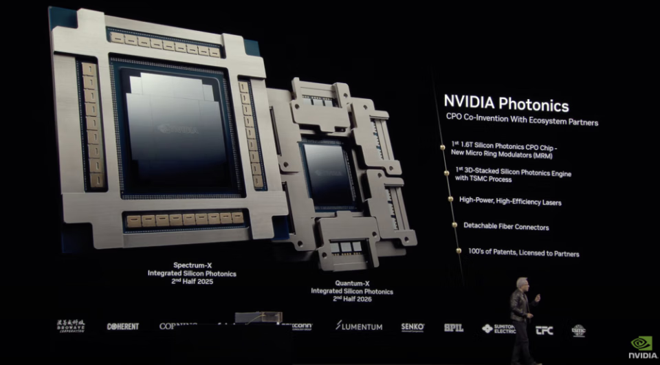 光电共封模块(CPO)的概念,简单来说就是将交换机芯片和光学模块共同封装,可实现光信号转化为电信号,充分利用光信号的传输性能。在此之前,业界就一直在讨论英伟达的CPO网络交换机产品,但一直迟迟未上线,黄仁勋在现场也给了解释——由于在数据中心中大量使用光纤连接,光学网络的功耗相当于计算资源的10%,光连接的成本直接影响着计算节点的Scale-Out网络和AI性能密度提升。GTC上展示的两款硅光共封芯片Quantum-X、Spectrum-X参数