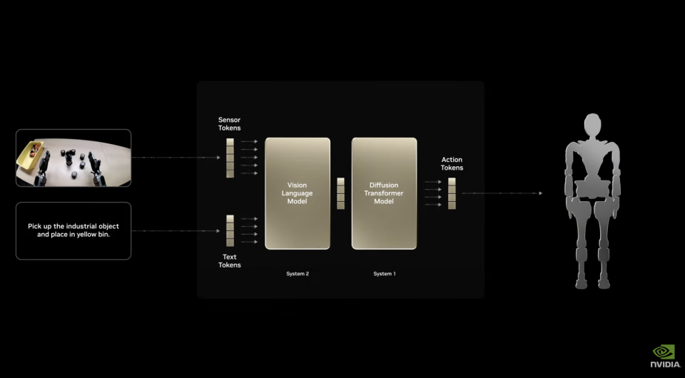 第二部分Cosmos Predict 能够从多模态输入生成虚拟世界状态,支持多帧生成和动作轨迹预测。这意味着,给定起始和结束状态,模型可以生成合理的中间过程。这是核心物理世界认知和构建能力。第三部分是Cosmos Reason,它是个开放且可完全定制的模型,具有时空感知能力,通过思维链推理理解视频数据并预测交互结果。这是规划行为和预测行为结果的提升能力。有了这三部分能力逐步叠加,Cosmos就可以做到从现实图像token+文字命令提示token输入到机器动作token输出的完整行为链路。这一基础模型应该确实效果不俗。推出仅两个月,1X、Agility Robotics、Figure AI这三家头部公司都开始用起来了。大语言模型没领先,但具身智能英伟达确实在第一梯队里。2)Isaac GR00T N1,世界第一个人形机器人基础模型有了Cosmos,英伟达自然而然用这套框架微调训练了专用于人型机器人的基础模型Isaac GR00T N1。它采用双系统架构,有快速反应的“系统1“和深度推理的“系统2“。它的全面微调,使得其能处理抓取、移动、双臂操作等通用任务。而且可以根据具体机器人进行完全定制,机器人开发者可用真实或合成数据进行后训练。这使得这一模型实际上可以被部署在各种各样形状各异的机器人中。比如说英伟达与Google DeepMind和迪士尼合作开发Newton物理引擎,就用了Isaac GR00T N1作为底座驱动了一个非常不常见的小迪士尼BDX机器人。可见其通用性之强。Newton作为物理引擎非常细腻,因此足够建立物理奖励系统,以在虚拟环境中训练具身智能。![]()