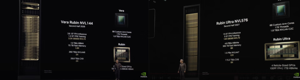 按照英伟达的路线图,GTC2025的主场就是Blackwell Ultra。不过,黄仁勋也借这个场子预告了2026年上市的基于Rubin架构的下一代GPU以及更强的机柜Vera Rubin NVL144——72颗Vera CPU+144颗 Rubin GPU,采用288GB显存的HBM4芯片,显存带宽13TB/s,搭配第六代NVLink和CX9网卡。这个产品有多强呢?FP4精度的推理算力达到了3.6ExaFLOPS,FP8精度的训练算力也达到了1.2ExaFlOPS,性能是Blackwell Ultra NVL72的3.3倍。如果你觉得还不够,没关系,2027年还有更强的 Rubin Ultra NVL576机柜,FP4精度的推理和FP8精度的训练算力分别是15ExaFLOPS和5ExaFLOPS,14倍于Blackwell Ultra NVL72。英伟达官方提供的Rubin Ultra NVL144和Rubin Ultra NVL576参数