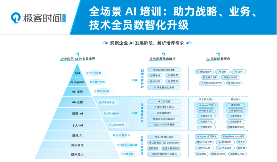随着 国产大模型 DeepSeek 的爆火,为企业的数智化转型打开了全新局面。它的易用性和场景化应用能力,使得非技术岗位员工也能快速掌握 AI 工具,推动全员数智化能力的普及。但很多企业面临着员工缺乏 AI 思维、难以将 AI 技术与业务深度融合等挑战。基于这些痛点,极客时间结合各行各业、不同职级、不同岗位的差异化需求,经过严谨调研和细致梳理,研发了《企业全员 AI 能力升级·培训项目》。