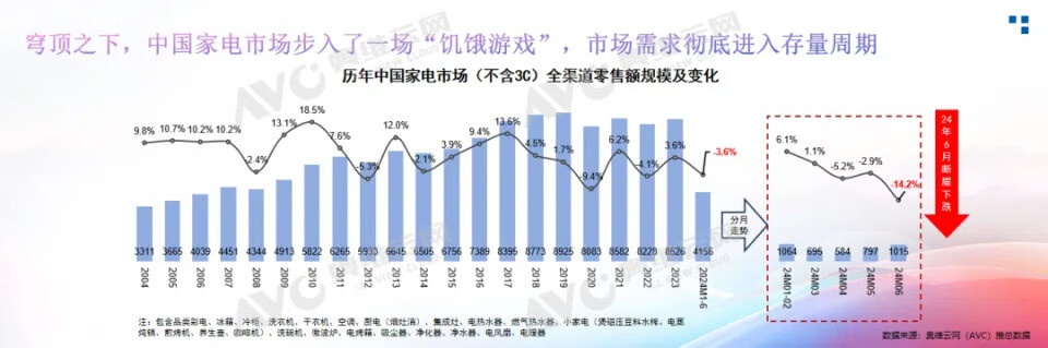 回顾2024年,上半年家电市场的持续低迷,使行业整体压力陡增。根据奥维云网(AVC)推总数据,2024年上半年中国家电市场(不含3C)全渠道零售额规模为4156亿元,同比下降3.6%,其中6月单月零售额为1015亿元,呈现同比14.2%的断崖式下滑。